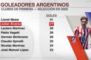 进入2025年,阿尔瓦雷斯在俱乐部和国家队已打进27球,阿根廷球员中仅次于梅西的41球。在阿尔瓦雷斯身后是劳塔罗(26球)、维格蒂(26球)、贝尔泰拉梅(26球)、斯皮内利(25球)、尼古拉斯-马丁内斯(24球)以及何塞-洛佩斯(23球)。