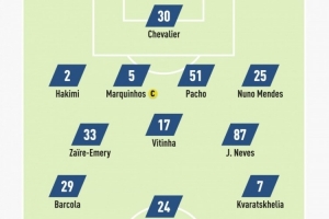 中场:扎伊尔-埃梅里、维蒂尼亚、若昂-内维斯