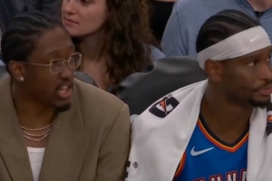 比赛最后时刻,镜头给到板凳席上的雷霆众将,亚历山大和仍在养伤的杰伦-威廉姆斯神同步。