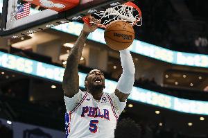76人内线德拉蒙德上半场替补出战表现出色,不仅是前场篮板抢得很凶,篮下终结也很高效。