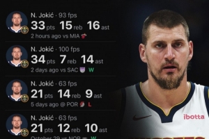 截止目前,约老师赛季七场比赛场均数据维持在了三双水准,场均24.1分13.4篮板12助攻,投篮命中率61.3%,真实命中率70.1%。这7场比赛中,他还5次拿下三双!