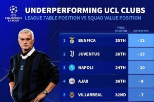 体育资讯11月6日讯 德国转会市场根据球队目前欧冠排名与阵容身价排名的差距,列出了本赛季欧冠表现不佳球队榜,本菲卡、尤文最差。