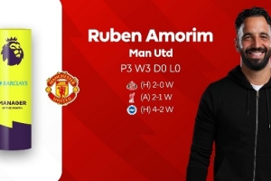 阿莫林成为了第6位获得英超月度最佳主帅的葡萄牙教练,此前有努诺、穆里尼奥、博阿斯、布鲁诺-拉热以及佩雷拉。