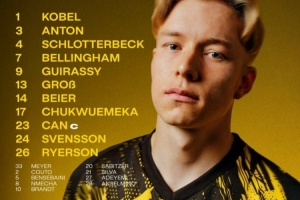 1-科贝尔,3-安东,4-施洛特贝克,7-小贝林厄姆,9-吉拉西,13-格罗斯,14-拜尔,17-丘库埃梅卡,23-埃姆雷-詹,24-斯文松,26-莱尔森