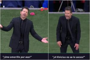 在一次犯规判罚之后,镜头拍到了马竞主帅西蒙尼正在对主裁曼萨诺抗议:“嘿!你在吹什么!冷静点!就为了这个出牌?”西蒙尼最后又摇着头说:“你不敢对维尼修斯出牌。”然后他又盯着第四官员重复了一遍这句话。
