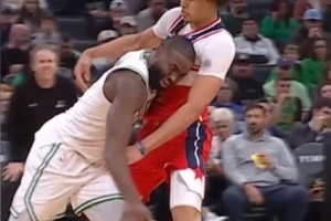 发际线粉事件之一:对阵奇才时杰伦·布朗发际线粉粘到对手白T上