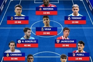 后卫:卡雷拉斯(皇马,5000万欧)、莫斯克拉(阿森纳,3500万欧)、阿森西奥(皇马,3000万欧)、普比尔(马竞,1600万欧)
