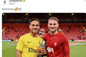 利物浦中场亚历克西斯·麦卡利斯特和他的哥哥凯文·麦卡利斯特(圣吉罗斯后卫)都入选了本期阿根廷队名单,利物浦官方社媒晒出麦卡兄弟的合照,配文:“兄弟。”
