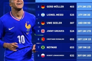 1、姆巴佩(537场):26岁10个月24天