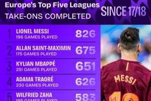 自17-18赛季五大联赛球员成功过人次数榜:
