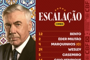 12-本托、2-米利唐、4-马尔基尼奥斯、14-韦斯利、5-卡塞米罗、16-卡伊奥·恩里克、8-吉马良斯、21-库尼亚、20-埃斯特旺、10-罗德里戈、7-维尼修斯