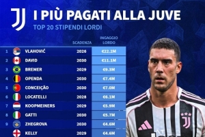 体育资讯11月20日讯 德国转会市场统计了尤文球员的税前年薪,并列出前二十名榜单,弗拉霍维奇2220万欧居首,戴维1110万欧次席。
