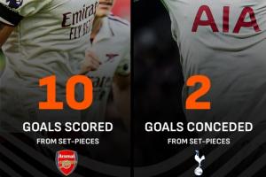 据统计,阿森纳本赛季英超通过定位球攻入10粒进球,占总进球的50%,这两个数字在英超联赛均排第一。