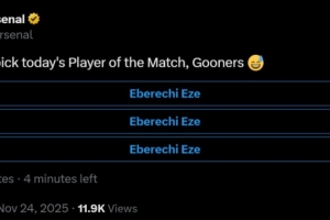 赛后阿森纳官方在社媒发布投票,评选本场最佳球员,三个选项均为上演帽子戏法的埃泽。