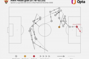 数据统计显示,这粒进球经历了22脚传递,是本赛季西甲第二多。