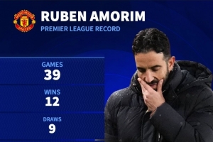 德国转会市场统计了阿莫林执教曼联的英超数据,他带领曼联参加39场英超比赛,战绩12胜9平18负,净胜球-10,场均拿到1.15分。