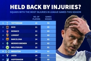 体育资讯11月25日讯 德国转会市场统计了本赛季五大联赛球队的球员伤缺场次,并列出榜单,热刺15人次累计伤缺92场最多,巴萨14人次伤缺62场第五。