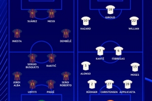 特尔施特根;阿尔巴、乌姆蒂蒂、皮克、罗贝托;布斯克茨、拉基蒂奇、伊涅斯塔、登贝莱;苏亚雷斯、梅西