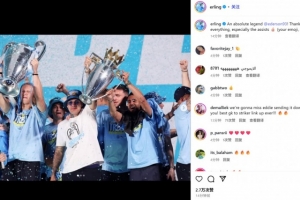哈兰德晒出他与埃德森三冠王赛季共同庆祝的合照,并配文:“一位绝对的传奇人物@埃德森!谢谢你的一切,尤其是你的助攻👍🏻(你的表情符号,总是如此😂)”