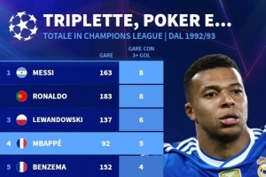 体育资讯11月27日讯 德国转会市场统计了1992-1993赛季欧冠改制以来球员单场进球3+的场次,并列出榜单,梅西、C罗8场居首,莱万6场、姆巴佩5场。