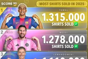 体育资讯11月28日讯 Score 90统计了2025年世界足坛的球员球衣销量榜,亚马尔以131.5万件排名第一,梅西第二,C罗位列第七。