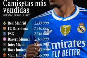 体育资讯11月29日讯 体育画报依据Euromericas Sport Marketing数据,统计了2025年截至目前世界足坛俱乐部球衣销量榜,皇马以313.3万件位居榜首,巴萨、巴黎分列二、三名。