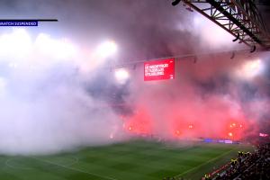 在中断43分钟后,比赛得以恢复,但仅持续了五秒钟。当时又有烟花直接被扔进球场,导致主裁判尼乌斯不得不再次将球员送回更衣室以保障他们的安全。