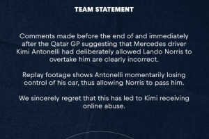 在卡塔尔大奖赛结束后,针对安东内利故意让诺里斯超越的言论显然是错误的。回放画面显示,安东内利当时暂时对赛车失去了控制,才使得诺里斯完成了超越。对于此事导致安东内利遭遇的网络暴力,我们深表遗憾。
