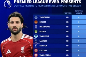 体育资讯12月1日讯 英超已经战罢13轮,《转会市场》统计了本赛季至今一分钟都未缺席的全勤非门将球员,共计16人:
