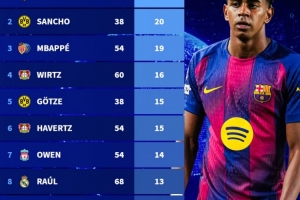 体育资讯12月2日讯 德国转会市场统计了U19球员在五大联赛中的助攻次数,并列出榜单,亚马尔30助居首,桑乔20助次席。