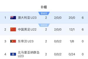 体育资讯09月07日讯 U23亚预赛前两轮结束,中国U22国足首场2-1险胜东帝汶,次轮10-0大胜北马里亚纳群岛,目前2胜进12球丢1球积6分排名小组第二,净胜球11球。