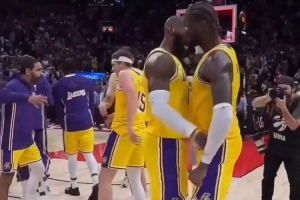 GIF-八村塁绝杀后詹姆斯和湖人队员们疯狂撞胸庆祝