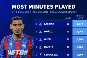 体育资讯12月5日讯 德国转会市场统计了本赛季五大联赛非门将球员的出场时间,并列出榜单,水晶宫球员占据前四名,范戴克第六,姆巴佩第八、凯恩第九。