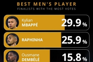 体育资讯12月6日讯 环球足球奖官方晒出了2025年最佳球员的投票情况,姆巴佩29.9%领跑。