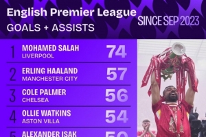 2023年9月以来英超参与进球榜: