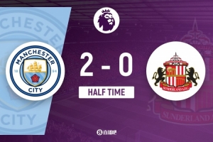 伤停补时3分钟。上半场比赛结束,曼城2-0桑德兰。