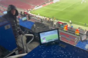 诺坎普球场顶棚未完工,拉波尔塔等贵宾比赛中遭暴雨冰雹“袭击”